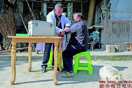 | ▲雍元书医生在为村里一名老人看病(4月12日摄)。