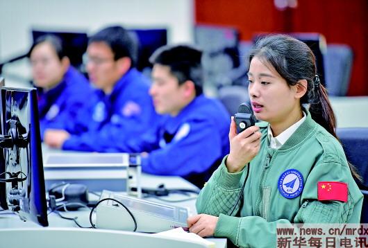 ▲C919试飞员团队中唯一一位女性、我国首位民机女试飞员蒋丹丹在航空工业试飞中心监控大厅内与试飞机组通话(3月6日摄)。