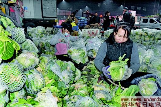 ▲菜商在整理种菜基地运来的菜花,准备发往全国各地(4月12日摄)。