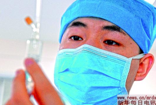 ▲5月10日,谢亚东在河南省人民医院呼吸重症监护室里调节药品滴速。