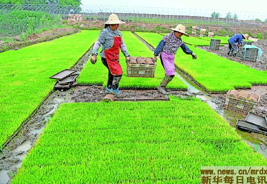 5月13日,全椒县六镇镇一家合作社的农民在搬运秧苗。近年来,安徽省全椒县六镇镇通过“合作社+农户”规模化育秧,帮助农民增收。
