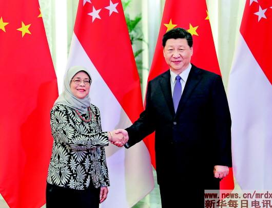 习近平指出,上个月李显龙总理刚刚来华出席了第二届“一带一路”国际合作高峰论坛和北京世界园艺博览会开幕式,这个月总统女士又来华出席亚洲文明对话大会,充分显示了中新关系的密切。中新互为发展机遇,长期以来携手同行,利益高度融合。两国要保持高层交往传统,对两国关系发展加以战略指引。中华民族有着守正创新的传统,共建“一带一路”就是包容、友好的过程,也是当前中新两国关系发展最大机遇。双方要把高质量共建“一带一路”打造成中新合作的新名片,用好用足“陆海新通道”和第三方市场合作,早出成果。要坚定支持经济全球化和多边主义,推动亚洲国家团结一致,聚焦合作,以举办亚洲文明对话大会为契机,共建亚洲美好家园。在建设多极世界的过程中,我们的朋友圈会越来越大。