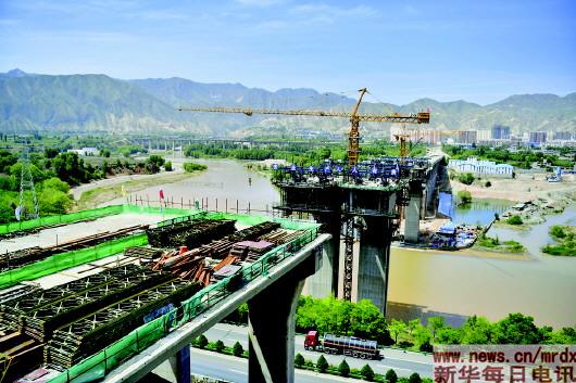 连接青海省海东市民和县川口镇和甘肃省兰州市红古区海石湾镇的川海大桥已完成80%的工程建设,预计年底合龙。 新华社记者张龙摄