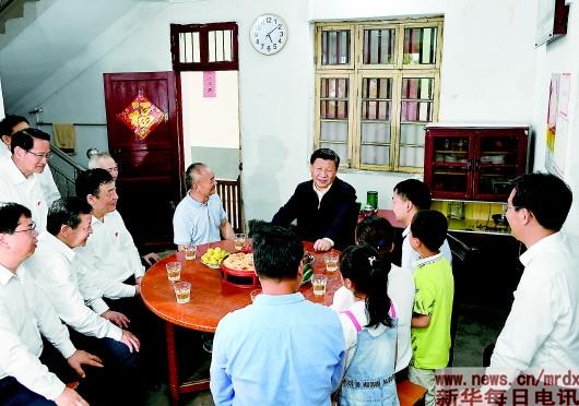 ▲这是习近平在红军烈士后代、退伍军人孙观发家,同孙观发一家和当地镇、村干部拉家常,详细了解老区人民生产发展和生活改善等情况。