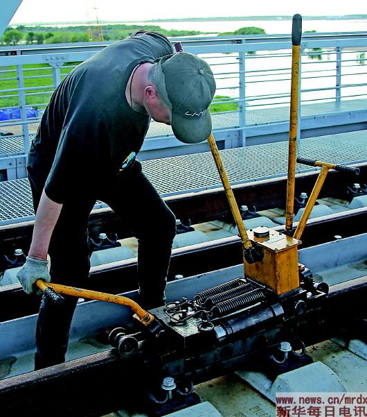 中铁大桥局中俄同江铁路大桥项目的建设者正在对钢轨精度进行微调(6月4日摄)。本报记者谢锐佳摄