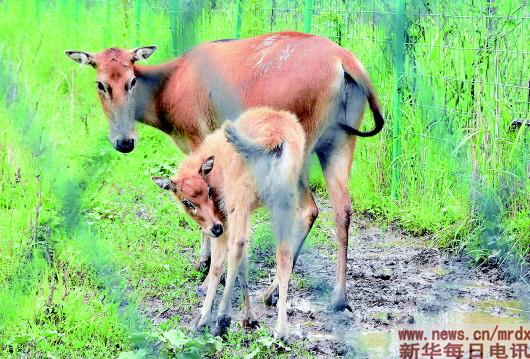 ▲麋鹿“小乖”和它的妈妈“点点”在一起(5月30日摄)。
