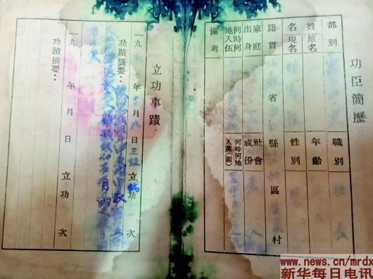 我在老人珍藏的发黄发黑的《功臣简历》上,找到了他的战斗故事。“一九五一年十二月八日,立三级战功一次。该同志在战斗中表现勇敢……(几个字已经看不清楚了)火箭弹退敌五次,冲锋杀敌20名,有力支援了前沿步兵。”