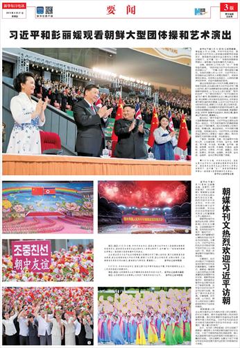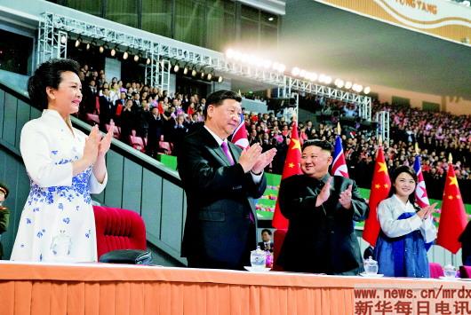 | 新华社平壤6月20日电(记者郝薇薇、李忠发)6月20日晚,中共中央总书记、国家主席习近平和夫人彭丽媛在朝鲜劳动党委员长、国务委员会委员长金正恩和夫人李雪主陪同下,在平壤“五一”体育场同朝鲜各界群众一道观看大型团体操和艺术演出。
