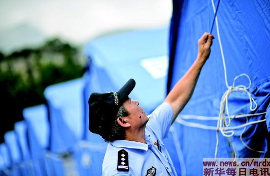 6月23日,王玉杰在四川珙县一处地震安置点内执勤。