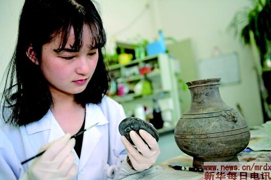 ▲西北大学文物保护技术专业学生刘珈如在修复一件陶罐(5月22日摄)。