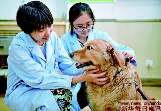 ▲西北农林科技大学动物医学专业学生在学校的动物医院内安抚一只宠物狗(5月25日摄)。