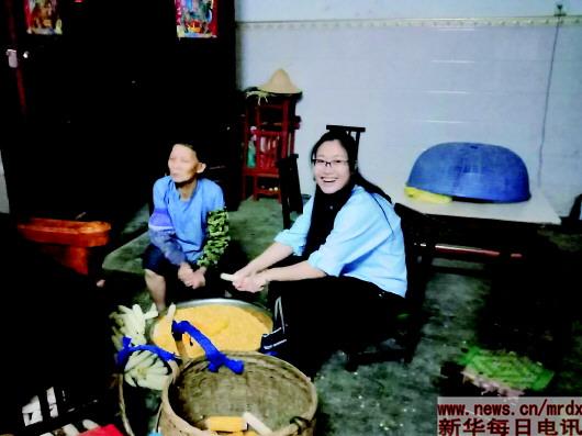 ◥黄文秀到村民家走访,主动帮村民掰玉米(资料照片)。