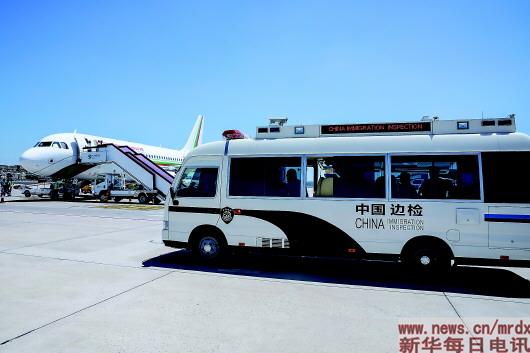 ▲2019夏季达沃斯年会期间,大连周水子出入境边防检查站启用移动智能验放车,在参会嘉宾专机抵达地点为他们办理入境通关手续(7月1日摄)。