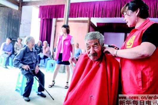 ▲7月1日,党员志愿者们在给老人们进行每月一次的集中理发。在杭州市临安区龙岗镇望湖村党支部的牵头下,党员姚秋萍组织成立一支专门为空巢老人服务的党员志愿服务队,定期为望湖村100多名老人义务理发。