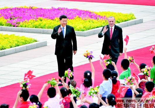 会谈前,习近平在人民大会堂东门外广场为埃尔多安举行欢迎仪式。杨洁篪、吉炳轩、王毅、夏宝龙、何立峰等参加。