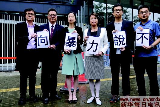 7月3日,在香港特区立法会,香港法律界人士手拿“向暴力说不”的纸张谴责暴力行径。