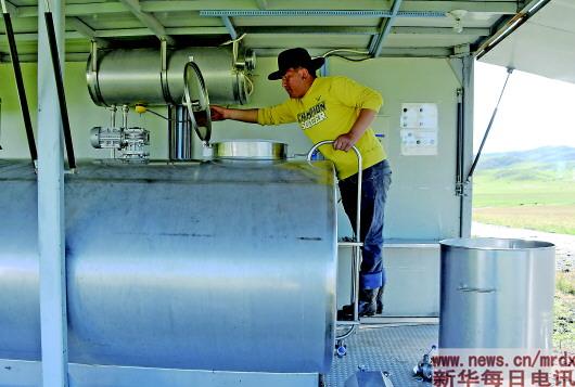 7月8日,在四川省阿坝藏族羌族自治州红原县的邛溪镇热坤村,林清沟十五公里奶站的技术人员在收奶。