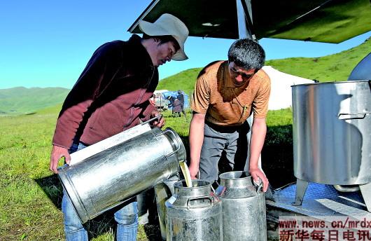 7月8日,在四川省阿坝藏族羌族自治州红原县的邛溪镇热坤村,林清沟十五公里奶站的技术人员(右)在牧民处收奶。
