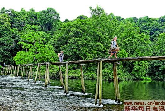 村民走过位于贵州省黎平县高屯街道上少寨村的红军桥(七月二日摄)。新华社记者杨文斌摄