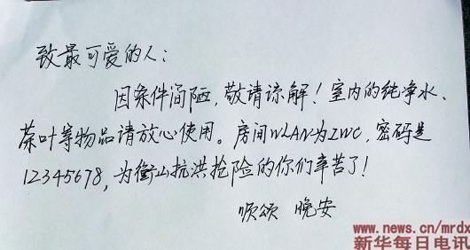 白纸上这样写道:“致最可爱的人:因条件简陋,敬请谅解!室内的纯净水、茶叶等物品请放心使用。房间WLAN为ZWC,密码是12345678,为衡山抗洪抢险的你们辛苦了!顺颂,晚安。”