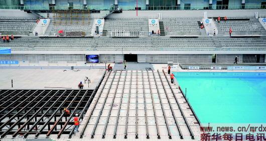 记者近日在“水立方”比赛大厅看到,曾举办北京奥运会游泳、花样游泳和跳水项目的标准泳池已经放空池水。泳池空间被一座冰场可转换钢结构“填满”,数十名工人在钢结构上铺设预制混凝土板。