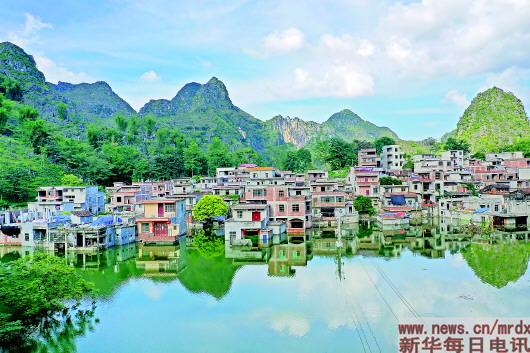 第一眼望过去,或许会以为这是一个风景秀丽的临湖村屯:蓝天白云之下、石山环绕之中,鳞次栉比的楼房前卧着一个碧绿的“湖泊”。仔细看,才发现水面上露出了树冠和电线杆顶端,不少房屋的一楼和二楼都已被淹没,通屯道路的近村路段被水隔断而成为“断头路”,“珍爱生命 远离危险水域”的警示牌十分醒目。