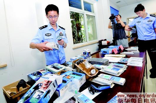 7月17日,上海市公安局青浦分局民警徐伟(左)向媒体展示收缴的部分假冒产品。