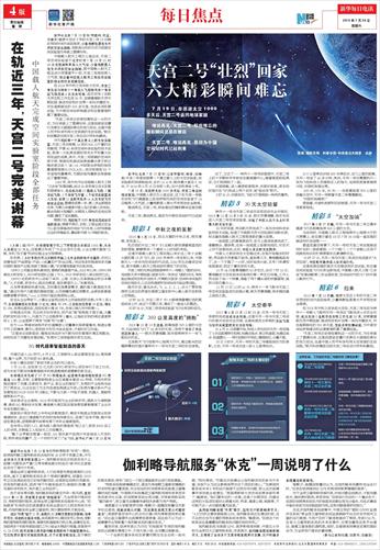 作为我国第一个真正意义上的太空实验室,天宫二号共搭载14项约600公斤重的应用载荷,开展60余项空间科学实验和技术试验,取得一大批具有国际领先水平和重大应用效益的成果。其中,天宫二号搭载的空间冷原子钟,根据在轨测试结果推算冷原子钟日稳定度达到7.2E-16;中欧联合研制的伽玛暴偏振探测仪(POLAR),成功探测到55个宇宙伽玛暴事例,为国际伽玛暴联合探测做出了重要贡献。