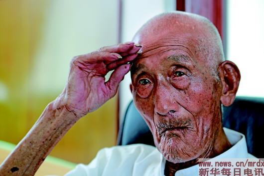 7月18日,在蓬莱市北沟镇阎家村,98岁的“活烈士”阎寿光在敬礼。