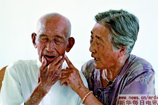 7月18日,在蓬莱市北沟镇阎家村,“活烈士”阎寿光的大女儿阎巧英(右)在指着老人作战时负的枪伤。