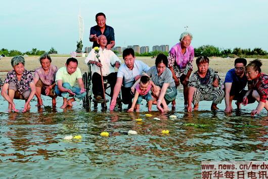 7月18日,在蓬莱市八路军挺进东北渡海出发地纪念广场前,张景宪(右七)、“活烈士”阎寿光(左四)及其后代撒下鲜花,祭奠1947年菏泽战役牺牲的烈士。