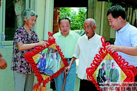 7月18日,在蓬莱市北沟镇阎家村,张景宪(右一)提着自己做的中国结前来探望98岁的“活烈士”阎寿光。