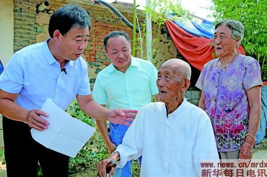 7月18日,在蓬莱市北沟镇阎家村,蓬莱市退役军人事务局的工作人员(左一)前来看望“活烈士”阎寿光。