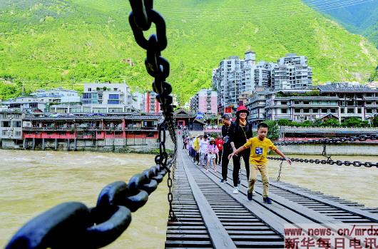 游客行走在位于四川省泸定县的泸定桥上(7月26日摄)。 新华社发(唐文豪摄)