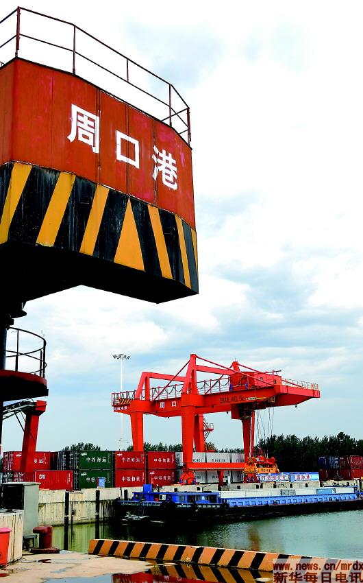 近年来,河南省周口市依托地理优势,推进沙颍河航道升级改造工程,疏通内河航运,以港口多式联运建设为切入点,大力发展临港经济。从周口中心港出发的船舶可经沙颍河至淮河、京杭大运河进而驶入长江,实现了内陆城市的商品货物通江达海。