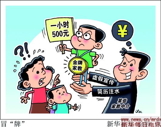 新华社广州7月31日电(记者郑天虹、刘娟、宋佳)正值暑期,家教生意更为走俏,一些机构甚至开出了金牌家教一小时500元、补齐语数外三科一年15万元的“天价”学费。 然而,“新华视点”记者调查发现,家教简历注水是业内的公开秘密,家长花高价请到的很有可能是家教中介虚假“包装”出来的老师;家教行业缺乏准入和专业标准,相关部门监管乏力,一旦发生事故难以追责。有关部门应推动制定行业标准,加强对家教市场的监管,促进家教行业规范化发展。