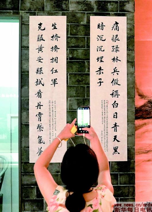 ▲8月1日,参观者在湖北省黄冈市红安县黄麻起义和鄂豫皖苏区革命历史纪念馆拍摄第一次喊出“红军”称号的对联。