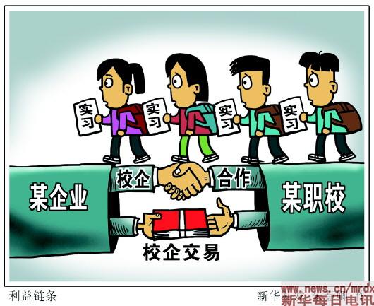 谨防“校企合作”沦为“校企交易” 业内人士认为,一些职业学校将学生随意送到一些与专业无关的企业实习,甚至以此牟利,这背离了职业教育的初衷。教育、人社等主管部门应加大对职校实习的监管力度,斩断职校实习背后的利益链条,防止“校企合作”成为“校企交易”。