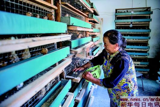 ▲在云南省禄丰县大北厂社区,村民陈菊芬在收取当天所产的鹌鹑蛋。她从1991年就开始养鹌鹑,每年收入十几万元(6月5日摄)。 摄影:本报记者胡超