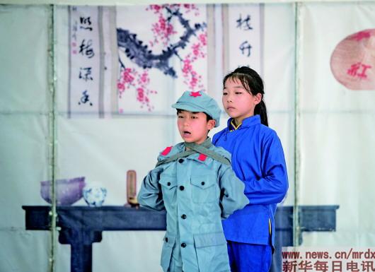 ▲8月4日,湖北省麻城市乘马岗中学的学生在表演情景剧《红军干娘》。