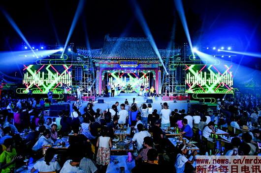 7月12日,第29届青岛国际啤酒节即墨古城会场启动,啤酒节是即墨古城“悦即墨·夜古城”夜经济主题活动的重要板块,为市民和游客送上一场传统与现代交融的夏日盛宴。这是顾客在即墨古城观看啤酒节演出。