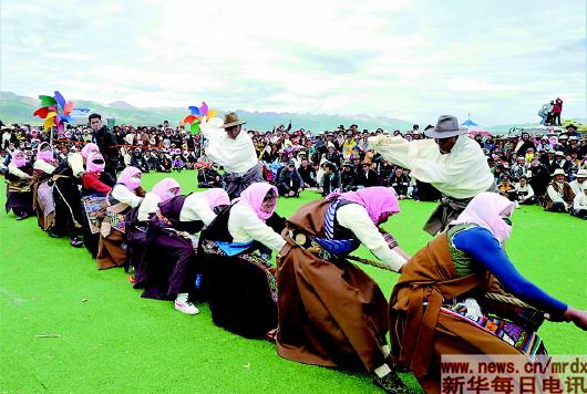 8月9日,西藏当雄县海拔4300米的赛马场举行民间传统拔河比赛,来自当雄各乡镇的牧民妇女盛装参加,场面喜庆而热闹。 新华社记者王益亮摄