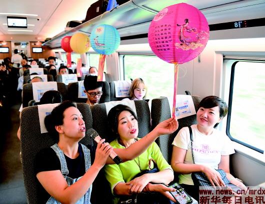 ▲9月12日,旅客在高铁车厢内猜灯谜。当日,中国铁路上海局集团有限公司南京客运段在部分高铁、动车上开展“月满金秋寄思乡”火车诗会活动。乘务员们为旅客朗诵诗歌,并邀请旅客一起猜灯谜、演节目、品月饼,迎接中秋佳节的来临。 新华社记者李博摄