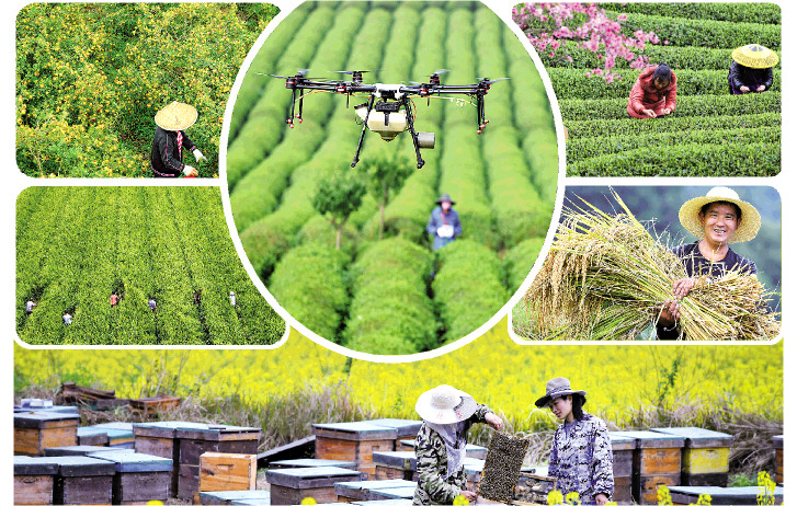 左上:贵州省龙里县谷脚镇的农民在采摘刺梨鲜果(2018年8月22日摄)。 右上:采茶工在贵州省余庆县松烟镇一处茶场采摘“明前茶”(3月31日摄)。 左下:农民在贵州省岑巩县国家级杂交水稻制种基地利用竹竿对杂交水稻进行人工授粉(8月1日摄)。 右下:9月17日,贵州省榕江县计划乡计划村阳开苗寨的村民在收割水稻。 中图:农技人员操作植保无人机在贵州省安顺市明英茶生产基地作业(5月23日摄)。 下图:养蜂人在贵州省黎平县肇兴镇皮林村检查蜜蜂酿蜜情况(3月12日摄)。 均为新华社记者杨文斌摄 |