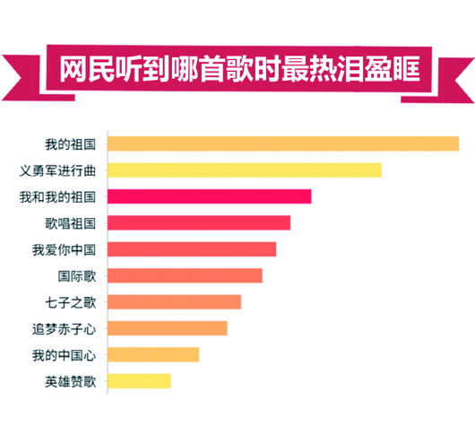70年来,中国发展日新月异。让人意料之外、又在情理之中的是,一些经典的歌曲总能超越时间。数据显示,引发网友共鸣最多的歌曲还是《我的祖国》《歌唱祖国》《义勇军进行曲》和《七子之歌》……