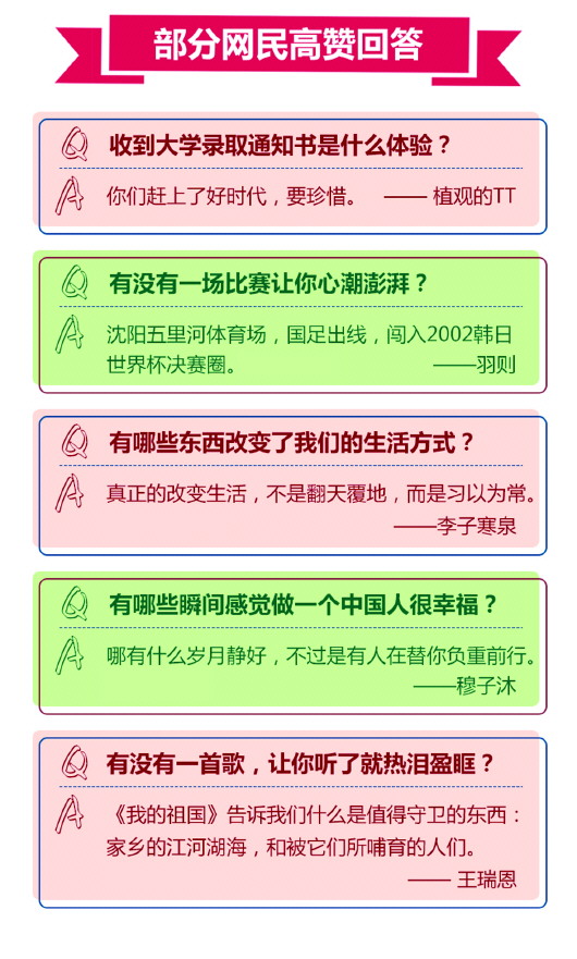 一位网友说:“今年是问答70年,但我想,只要中国继续发展进步,这个‘问答’就永远不会停止。我非常想知道到国庆80年、90年、100年时,我会给出什么回答。”