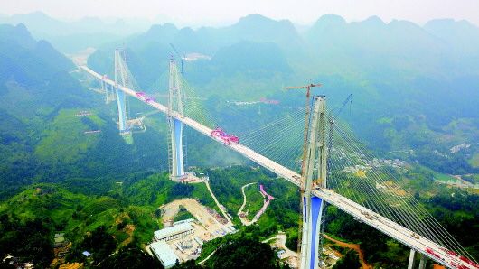 ▲9月26日,332米高的全球最高混凝土桥塔——贵州平塘至罗甸高速公路控制性工程平塘特大桥成功合龙。大桥全长2135米,桥面宽30.2米,规划双向4车道,是一座三塔双索面叠合梁斜拉桥。三座桥塔的高度分别为320米、332米和298米,相当于在峡谷之中建了三座100多层高的大楼。大桥预计今年底通车,届时平塘到罗甸的通行时间将从2个半小时缩短至1小时,将成为连接贵州南部的交通要道,对助推滇黔桂石漠化片区脱贫攻坚具有重要意义。 新华社记者杨文斌摄