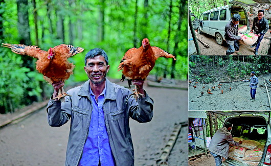 拼版照片:左图为在广西柳州市鹿寨县拉沟乡大坪村古报瑶寨,50岁的罗老友在展示合作社养殖的瑶山土鸡;右图为罗老友在山上搬运玉米、喂鸡的场景(照片均摄于10月26日)。罗老友是大坪村的贫困户,目前和村里的几名贫困户一起养殖4000多只瑶山土鸡,自己还种了两亩罗汉果,预计今年就可以脱贫。