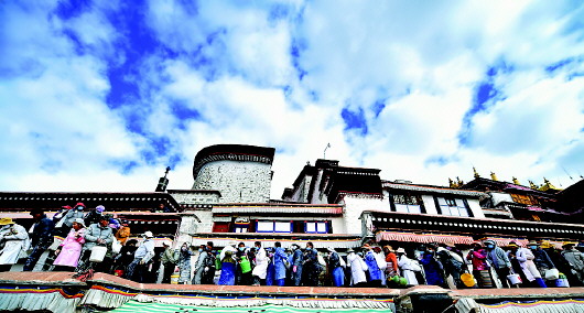11月1日,布达拉宫例行的“年度美容”——墙体粉刷工程正式启动。这是运送涂料的义工和施工人员。 新华社记者觉果摄
