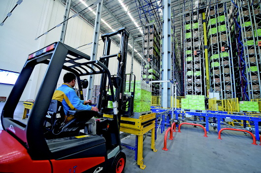 工作人员在南京市雨花经济开发区一家智慧物流基地内忙碌(2016年11月3日摄)。整个物流基地实现全流程自动作业,从订单生成到商品出库,最快可缩短到30分钟。